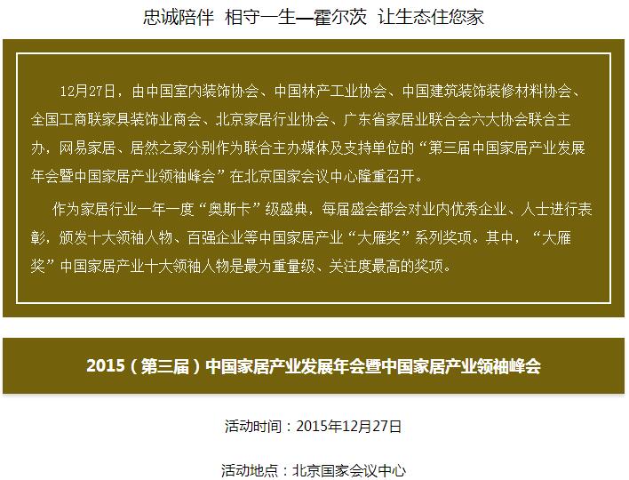 霍爾茨榮獲2015中國家居產業十大知名家居品牌