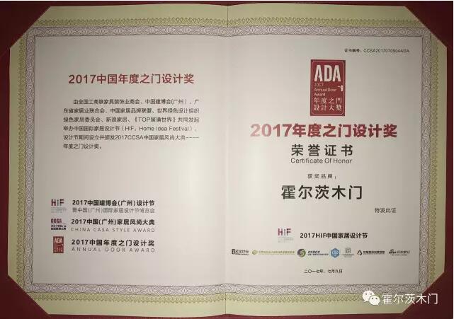 中國(guó)建博會(huì)(廣州)第二天,在2017中國(guó)家居風(fēng)尚大典CCSA 的活動(dòng)現(xiàn)場(chǎng) ,上演著一場(chǎng)中國(guó)頂級(jí)家居品牌進(jìn)行跨界時(shí)尚傳播的盛宴。榮譽(yù)不斷,霍爾茨木門獲得2017年度之門設(shè)計(jì)獎(jiǎng)!