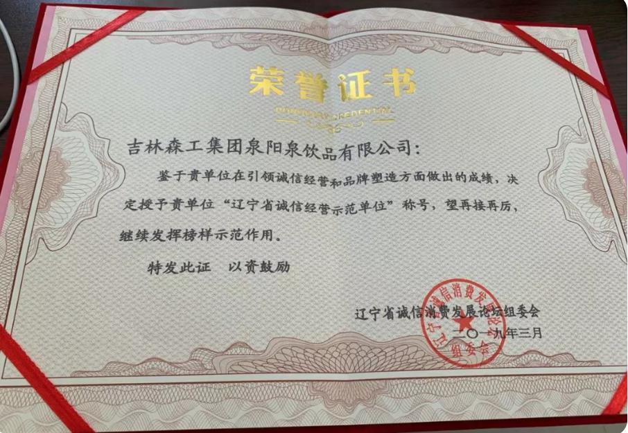 為了更好地貫徹落實習(xí)近平總書記在民營企業(yè)家座談會上的講話精神,以“保質(zhì)保量、誠信經(jīng)營、綠色消費”為主題,樹立一批“講誠信,負(fù)責(zé)任,守法紀(jì)”的先進(jìn)典型。為企業(yè)與企業(yè)之間、企業(yè)與單位之間、企業(yè)與消費者之間搭建了一個很好的交流、合作平臺。在此次論壇中,吉林森工集團泉陽泉有限公司榮獲“遼寧省誠信經(jīng)營示范單位”榮譽稱號。