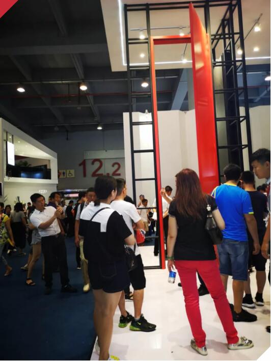 展廳入口是兩扇4.8米高的單開室內門,濃艷的中國紅與沉穩的黑理石,以工業風氛圍濃厚的簡約設計陪襯,彰顯了不一樣的時尚態度,來往者紛紛聚在此處,用高大上又顏值過關的木門為背景,拍照打卡,不亦樂乎。展廳的內在布置也均以不繁復的鋼管架構為陳設,眾多材質、花色、造型不一的木門展品用以非常規的規模呈現,2.8米的高度與更加高大的灰色背景形成對比,加之燈光、軟裝等道具的映襯,極具質感和時尚感的霍爾茨時尚木門耀眼奪目。尤其是霍爾茨木門的新品——輕奢系列和凈醛門系列,輕奢系列是萊德門系列的升級款,北歐簡約中自有奢適氣韻,更加貼合主流年輕群體的審美需求;凈醛門系列則是自問世以來首度亮相南方市場,“凈醛黑科技”的融入讓凈醛門的外表與普通木門別無二致,絲毫不會妨礙其美觀性和時尚性。
