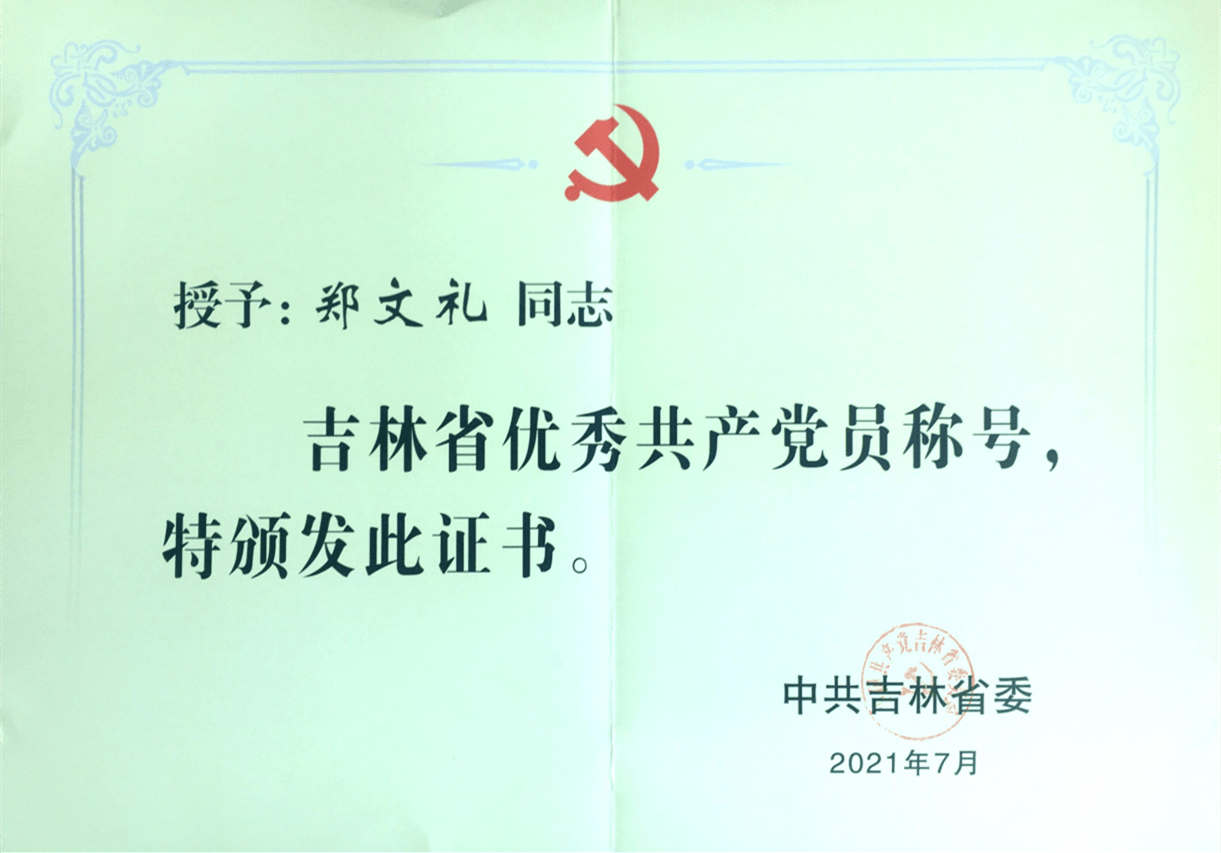 在中國共產黨建黨100周年即將來臨之際,2021年6月28日上午,吉林省委召開全省“兩優一先”表彰大會,我公司鄭文禮同志被授予“優秀共產黨員”稱號。