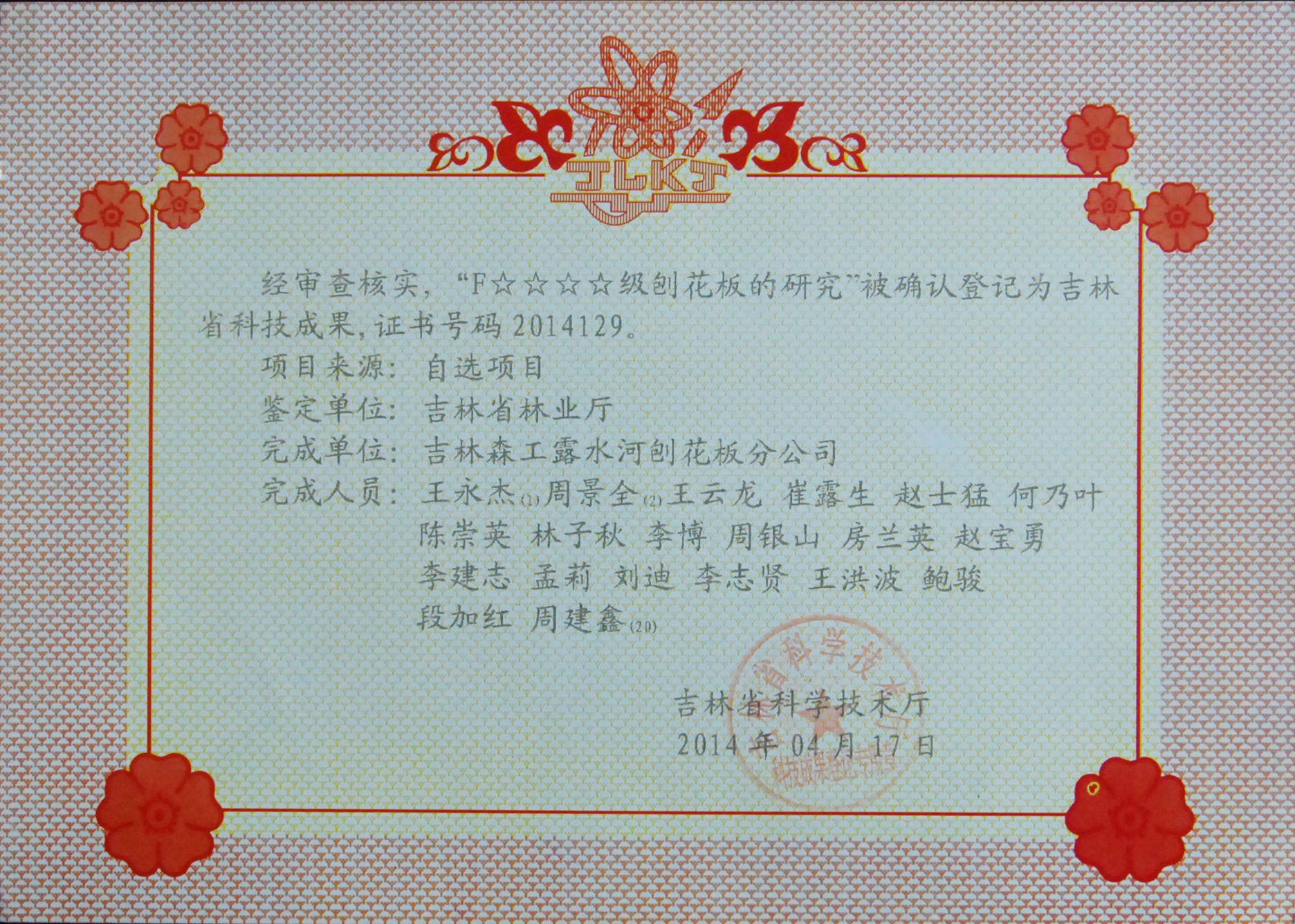 吉林森工露水河刨花板分公司多年來組織技術人員進行科技攻關,在成功研發的環保產品E0級刨花板系列產品基礎上,進一步改進生產工藝,有效控制板材中“游離甲醛”含量,經過反復試驗,最終研制成功甲醛含量更低的F☆☆☆☆級刨花板膠,用F☆☆☆☆級膠制造的刨花板,甲醛含量基本上與天然木材的含量相等,真正實現了板材的無害、環保。在2014年3月22日,通過了吉林省科技廳的科技成果鑒定,參加鑒定的專家一致認為F☆☆☆☆級刨花板產品有跨越性的創新,該項目多項新技術達到國內先進水平,建議盡快推廣應用。