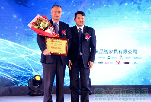 2015年4月16日,露水河刨花板戰略合作客戶重慶品智家具有限公司(家由萊)為期兩天的第十二屆加盟商大會圓滿落幕。吉林森工銷售公司常務副總經理張勇軍應邀參會。會上,吉林森工露水河被授予“2014家由萊最佳配套商”稱號。